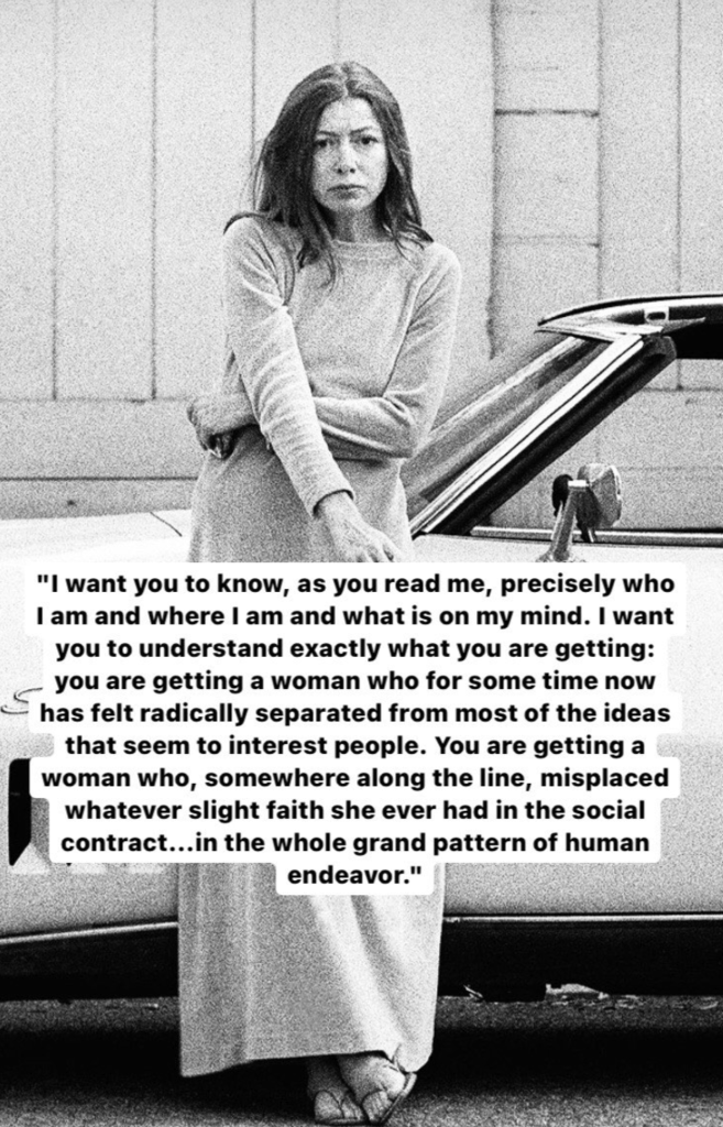 I clicked on it and read the caption that mentioned that Joan died on December 23rd, 2021. What’s strange is that, on that date, I was also on Instagram, checking pictures for inspiration, and I stumbled upon Didion’s quotes. I was taken with great sadness when I read that she left the world two days before Christmas. She’s probably one of the very few authors whose writings shake my soul.